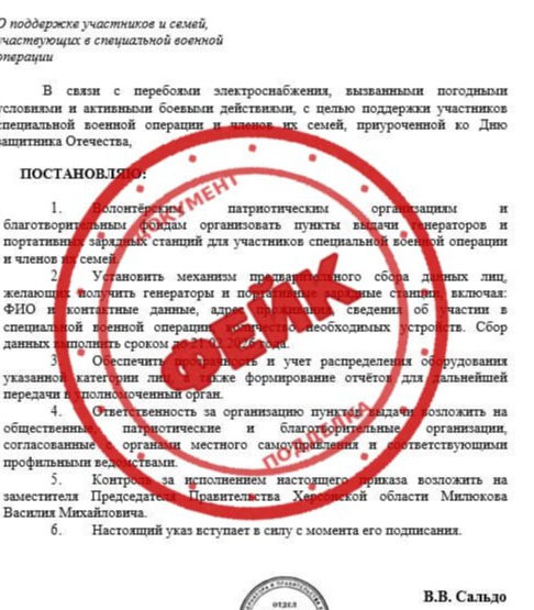 «Пропагандисты врага разгоняют в интернете очередную поделку — якобы мой «указ» о раздаче генераторов. Документ, которого в природе не существует. Авторам...